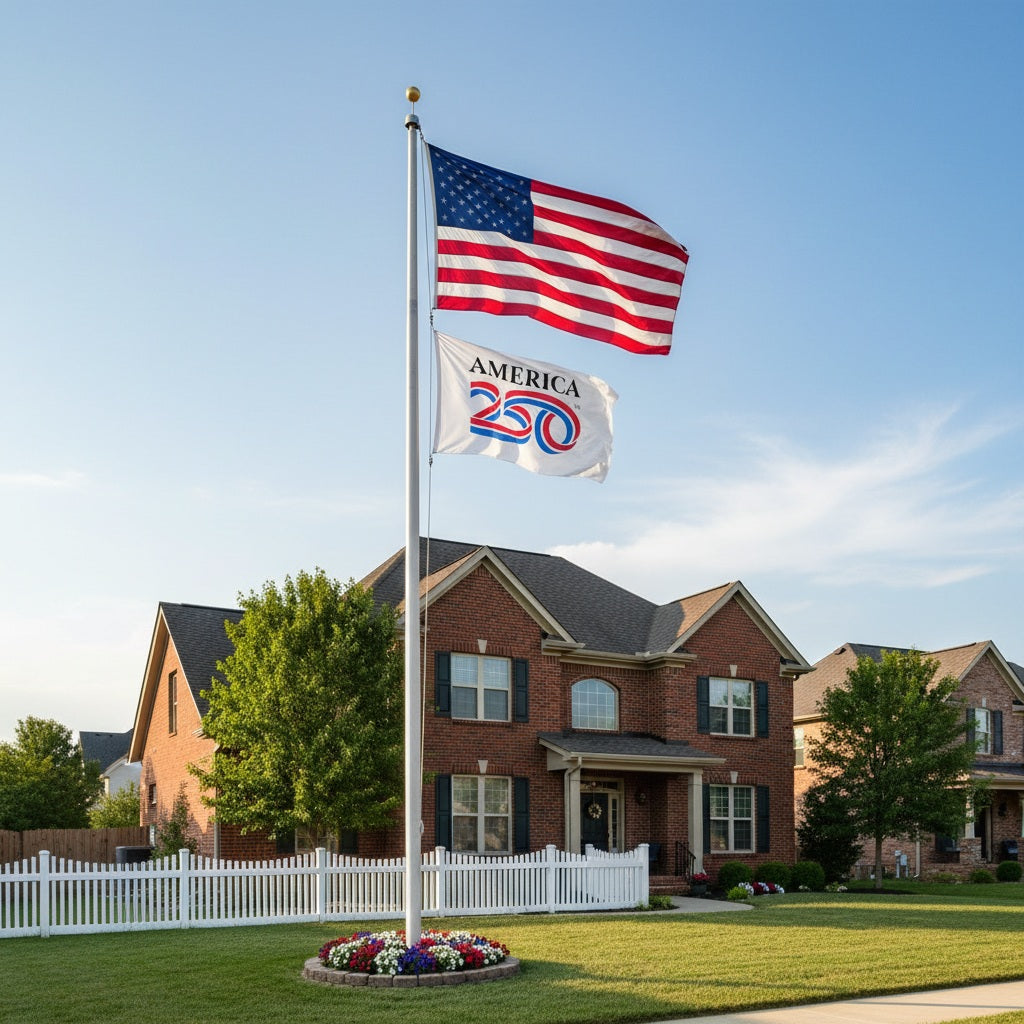 Official America 250th Anniversary double sided white flag in size 2x3 feet. The design and wording reads correctly on both sides. Picture displays how the design will appear from the front and back side. Fly this flag from your telescoping or house flagpole (sold separately) or display indoors as wall decoration. Made from fade resistant 100d nylon with heading, grommets and four rows of stitching around the whole flag for maximum durability when flown outside. Made in America.