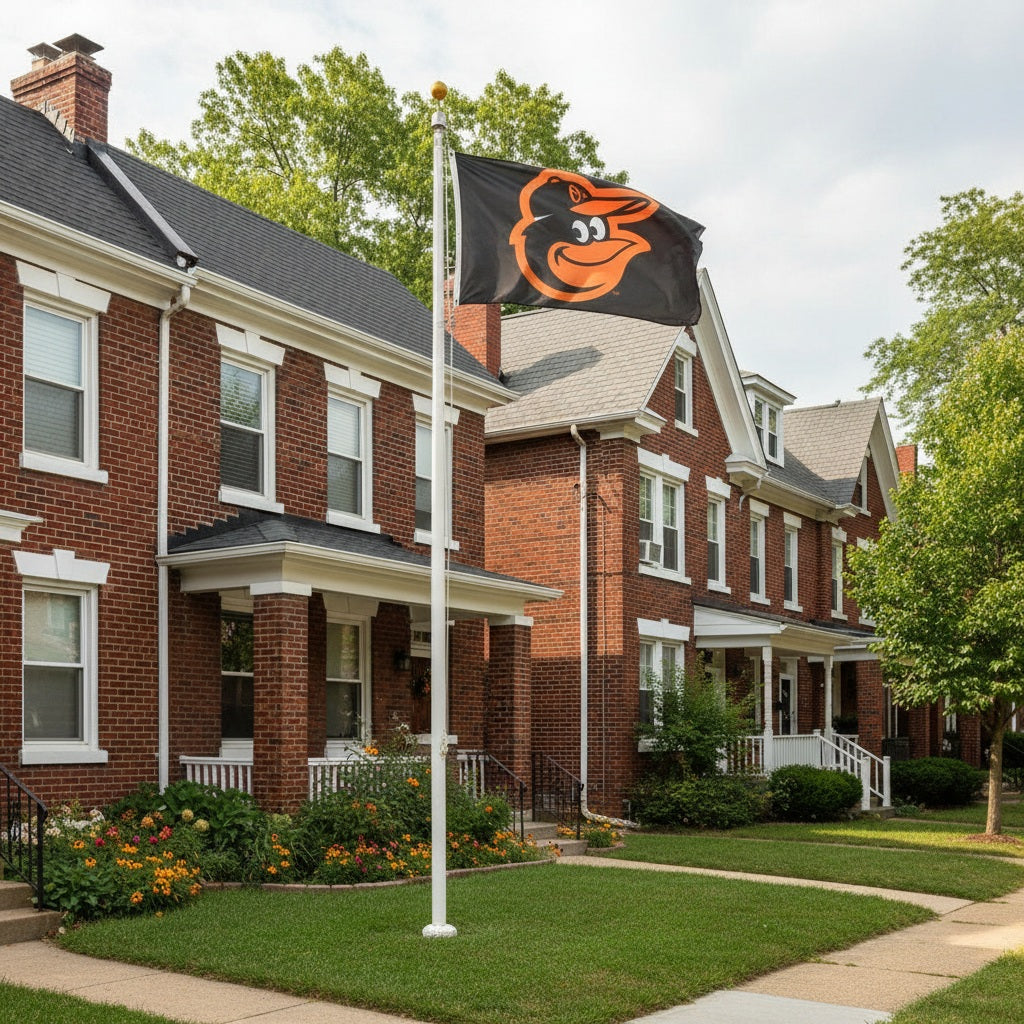 Baltimore Orioles flag in size 3x5 feet with a licensed 2-sided logo on black. The Orioles logo reads correctly on both sides - picture illustrates how the logo will appear from the front and back side. This double sided MLB flag can be flown on a flagpole (sold separately) or used as a decorative piece for walls or offices. Crafted from fade resistant 100d nylon fabric, it features reinforced heading, grommets, and four rows of stitching along all sides for unparalleled durability. Since this is a double sided flag it is heavier and will require a 15 mph wind or more before it will start flying.