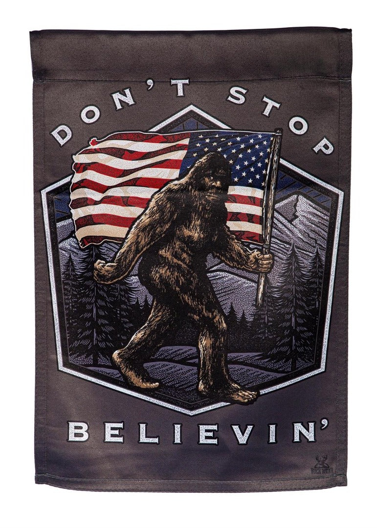 Show your patriotism and your love for the mysterious with this unique Bigfoot "Don't Stop Believin'" 2-sided garden flag. This eye-catching flag features a detailed illustration of Bigfoot proudly carrying the American flag, set against a backdrop of a mountain scene. The phrase "Don't Stop Believin'," a nod to a popular anthem, is prominently displayed, adding a touch of humor and inspiration. The 2-sided design ensures that the image and text are visible from any angle, allowing your patriotic spirit and your fascination with Bigfoot to be on full display. This flag is an excellent conversation starter and a fun way to express your individual style and interests. It's an ideal gift for anyone who enjoys Americana, cryptids, or unique garden decorations. Add this flag to your collection and let your flag wave with pride and a touch of the extraordinary.