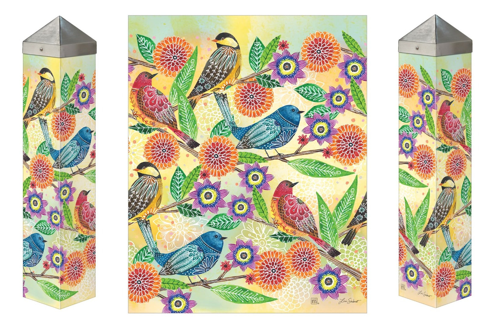 Invite the beauty of nature into your garden with our exquisite 20-inch Bird Song Art Pole by the designer Lori Siebert! This stunning garden accent is more than just a decorative piece; it’s a vibrant celebration of the avian world. Standing at a graceful 20 inches tall, the art pole is meticulously crafted with a durable, pvc weather-resistant material. Its design showcases a symphony of colorful birds perched amidst blossoming flowers and intricate branches, all rendered in vivid detail. The artwork wraps around the pole, ensuring that the beautiful imagery is visible from every angle. The picture shows all 4 sides of the art with two different angles of the sides.