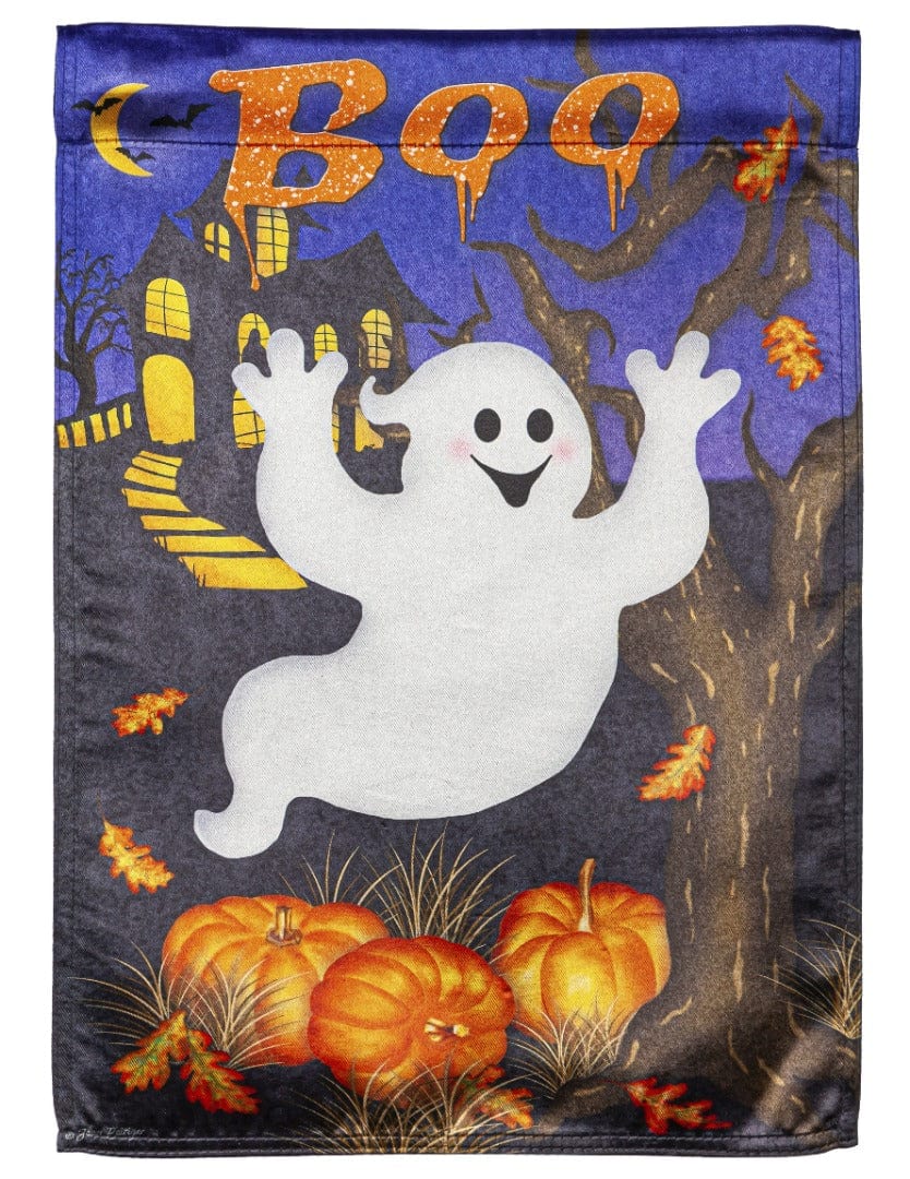 Boo Ghost double sided decorative Halloween garden flag. This Boo Ghost garden flag features a large ghost in the center of the flag with a haunted house in the background, pumpkins below and the word "Boo" at the top in polka dotted orange. The design and wording reads correctly on both sides of this Halloween yard flag. Decorate your home for Halloween and fly this decorative flag from your standard garden stand (sold separately).
