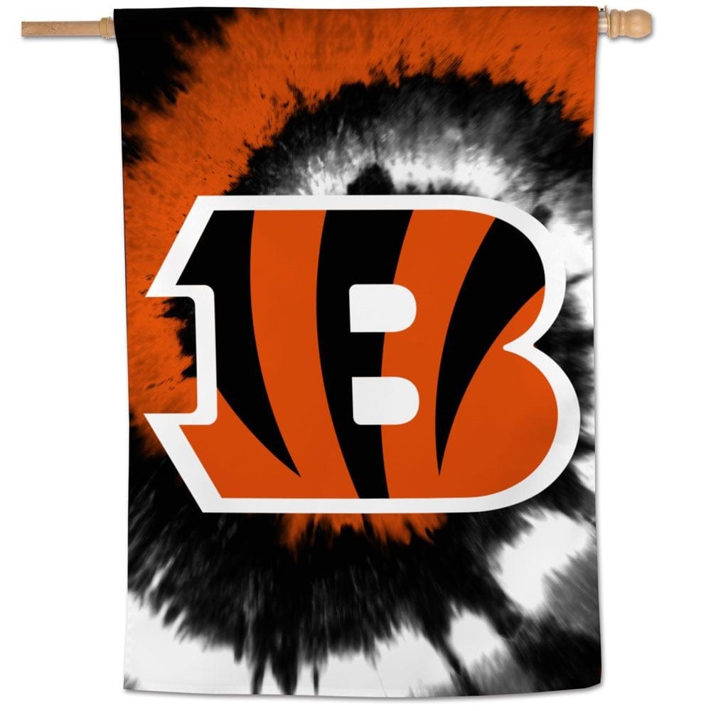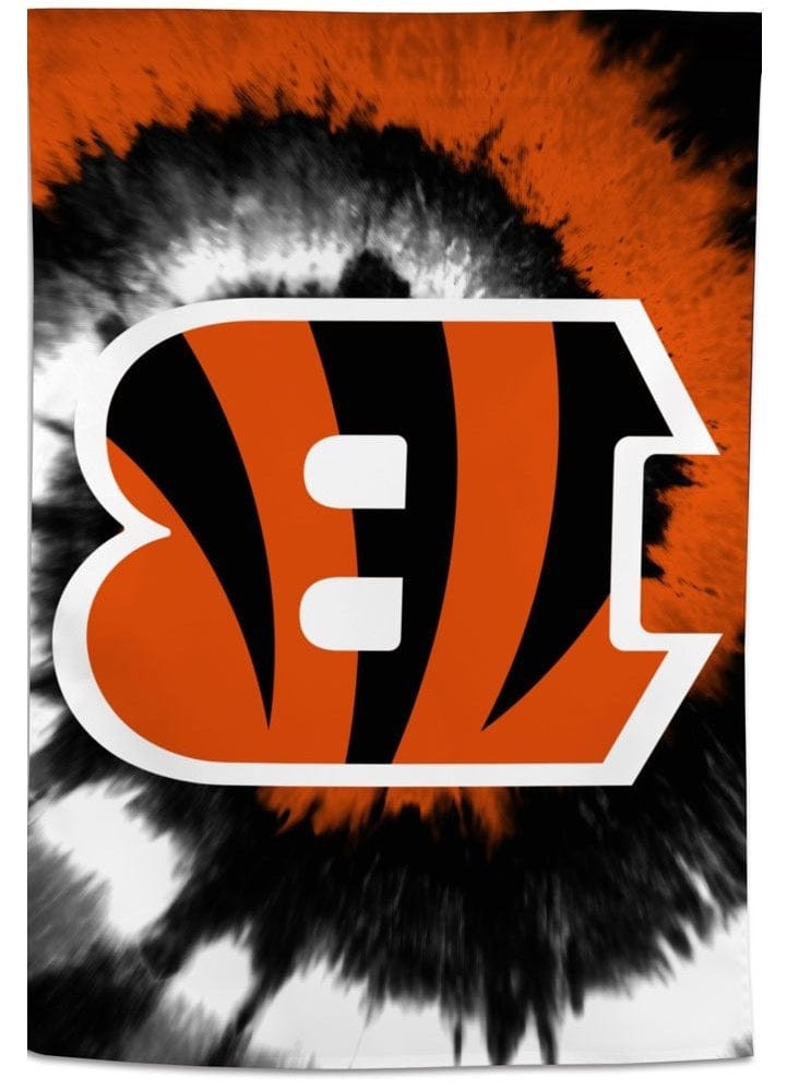 Officially licensed Cincinnati Bengals tie dye vertical house flag. The NFL Bengals logo on the tie dye background is visible on both sides with the opposite side being backwards. Single sided banner with the colors being lighter on the back side - pictures show the front and back sides of this Cincinnati Bengals banner. Designed to hang vertically from your house flagpole (sold separately) or display indoors as wall decoration. This official NFL banner is made of polyester fabric that is designed to withstand all weather conditions and it has a pole sleeve and tab making it easy to display. Printed in the United States on imported fabric.