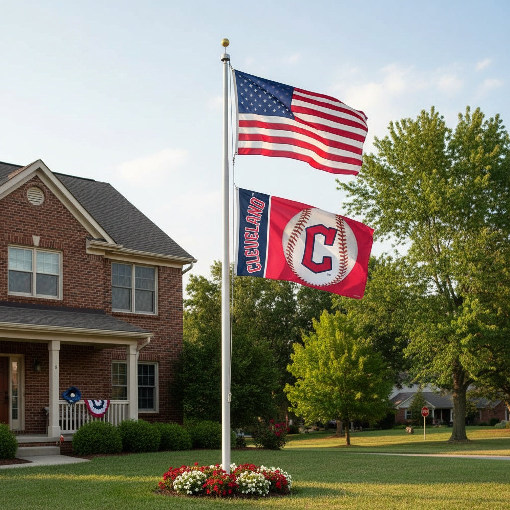 Cleveland Guardians flag in size 3x5 feet. The Guardians logo on the baseball and wording reads correctly on one side only with the opposite side being backwards. Single sided MLB flag with the colors being lighter on the back side. Picture illustrates how the design will appear from the front and back side. You can fly this Wincraft deluxe 3x5 flag from your telescoping, traditional or house flagpole (all sold separately) - can also be displayed as wall, office or bedroom decoration. This MLB Guardians flag is made out of premium polyester with heading, two grommets and four rows of stitching on the fly end for maximum durability when flown outdoors.