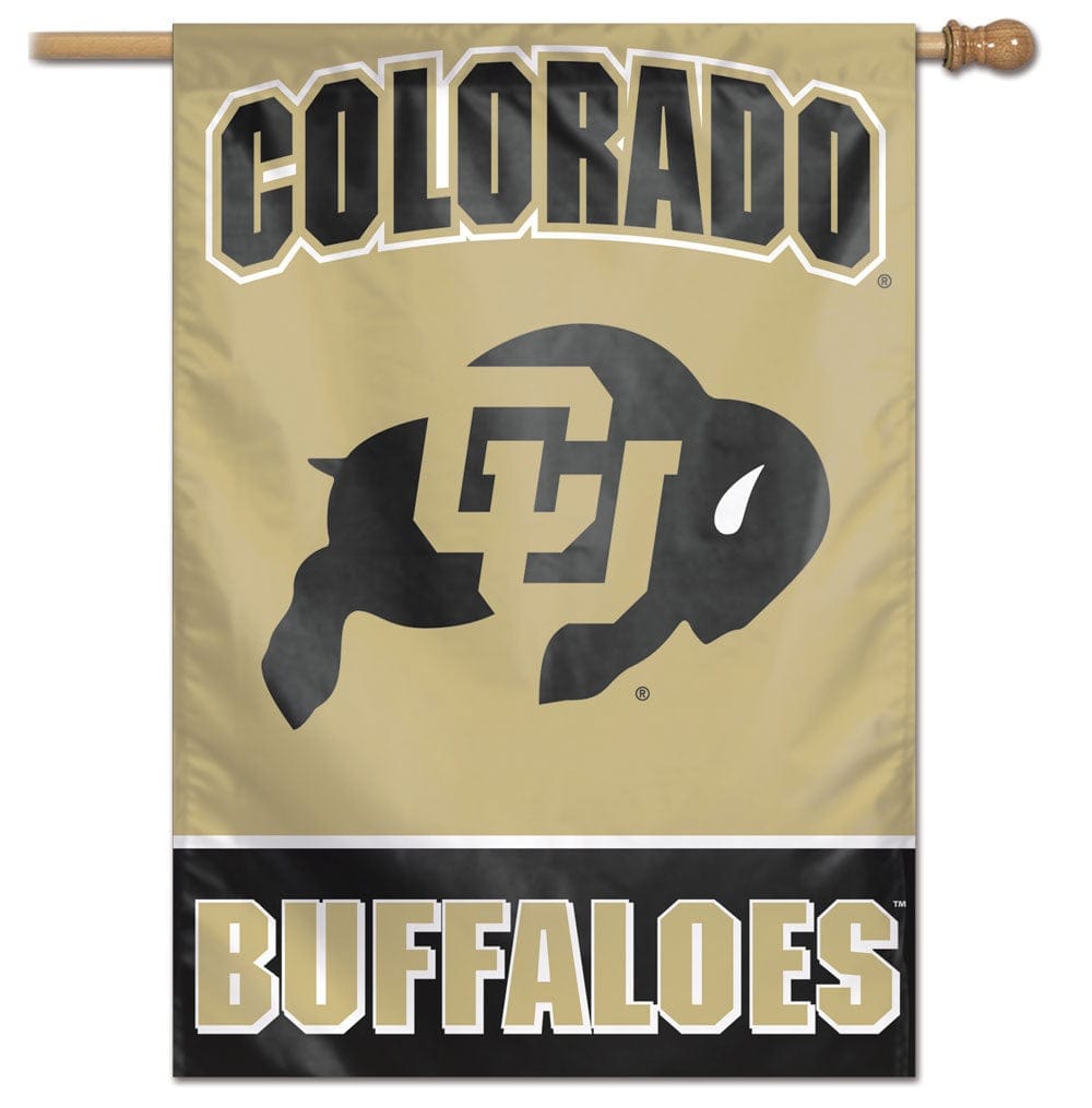 Officially licensed Colorado Buffaloes banner.  The CU Buffalo logo and wording on the stripe background is visible on both sides with the opposite side being backwards.  Single sided banner with the colors being lighter on the back side.  Pictures show the front and back design of this Colorado Buffaloes banner.  Designed to be displayed from your house flagpole (sold separately) or it can be displayed indoors as wall decoration for your office, garage or basement.  Made out of polyester with pole sleeve and tab.  Printed in the USA on imported fabric.