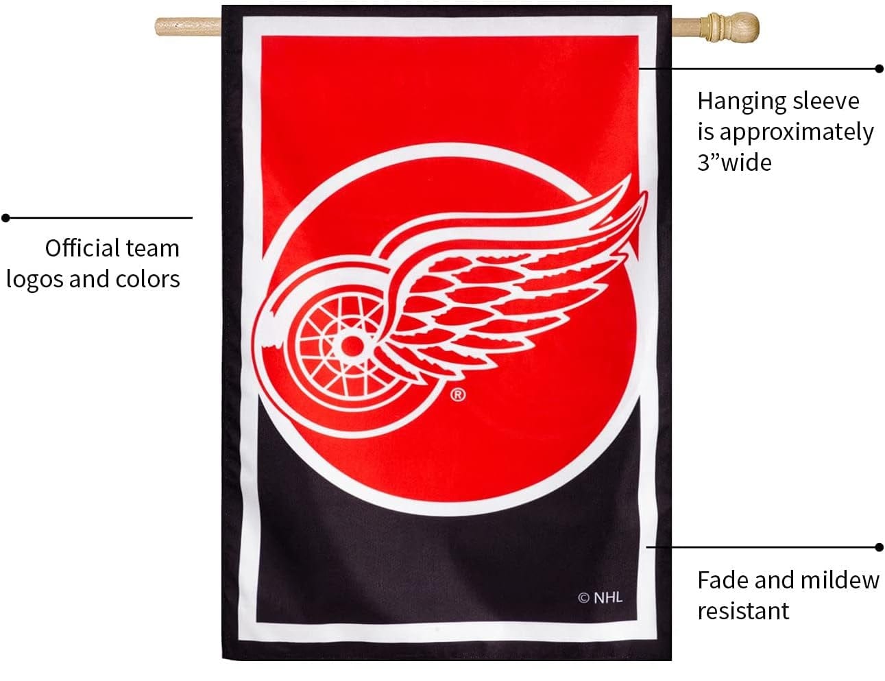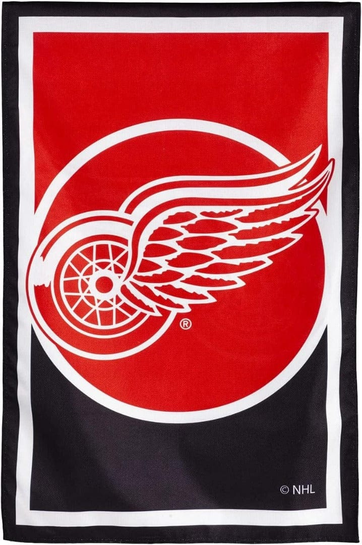 Officially licensed Detroit Red Wings double sided banner. This NHL banner features the Detroit Red Wings official logo and colors. The design and wording reads correctly on both sides of the banner. Fly this 2 sided vertical Detroit Red Wings flag from your house flagpole (sold separately) to show your support of the NHL Red Wings hockey team.