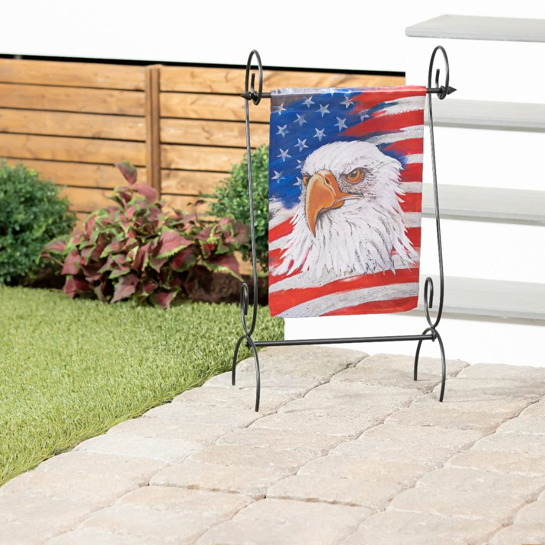 Eagle and flag double sided patriotic garden flag. This decorative garden flag features a majestic bald eagle with the background being a United States flag. The design reads correctly on both sides of the yard flag. Decorate your home for patriotic holiday's or any time of the year and fly this garden flag from your standard garden stand (sold separtely).