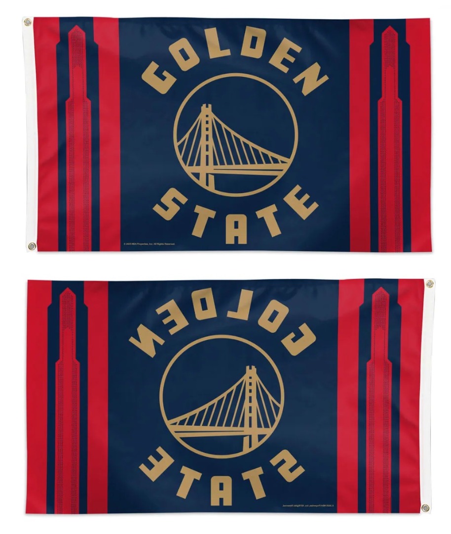 Golden State Warriors City flag in size 3x5 feet. The design and wording reads correctly on one side only with the opposite side being backwards. Single sided NBA Flag with the colors being lighter/faded on the back side. Picture illustrates how the design will appear from the front and back side. Made from premium 300d polyester fabric and finished with a heading, two grommets and a reinforced fly end with 4 rows of stitching.