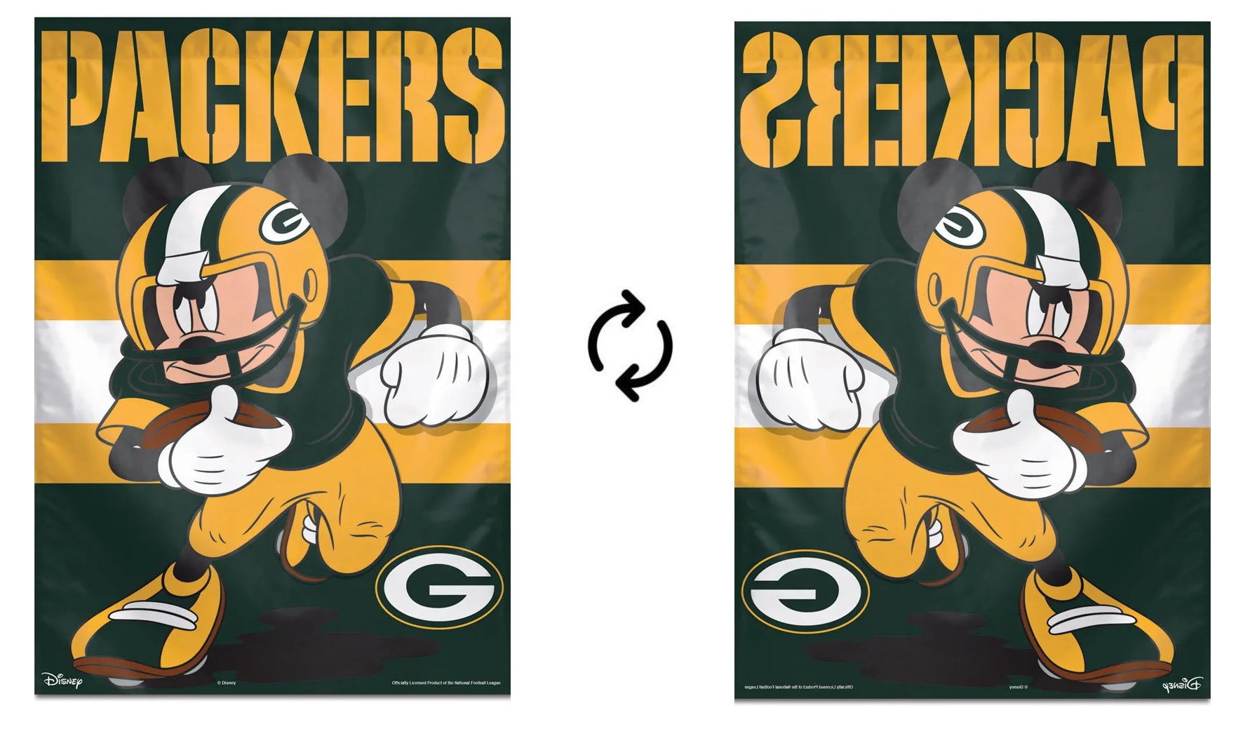 Green Bay Packers Mickey Mouse banner in vertical size 28x40 Inches. This flag features Disney's Mickey Mouse running with the football in a Packers uniform - the image and wording reads correctly on one side only with the opposite side being backwards. Single sided NFL banner with the colors being slightly ligher/faded on the back side. Picture illustrates how the design will appear from the front and back side. Combine your love for Mickey Mouse and the Green Bay Packers football team by flying this licensed flag from your house flagpole (sold separately) or display indoors as wall or room decoration. Made from imported polyester with pole sleeve and tab.