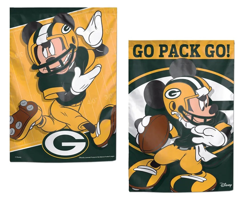 Green Bay Packers 2 sided garden flag. This licensed Disney Mickey Mouse NFL garden flag features two different designs in one flag - picture displays the front and back sides. Made from soft imported polyester fabric with a 1 inch sleeve for flying from your garden stand (sold separately) - Display in your window or as wall decoration. Show your passion for Mickey Mouse and the Green Bay Packers with this licensed NFL flag.