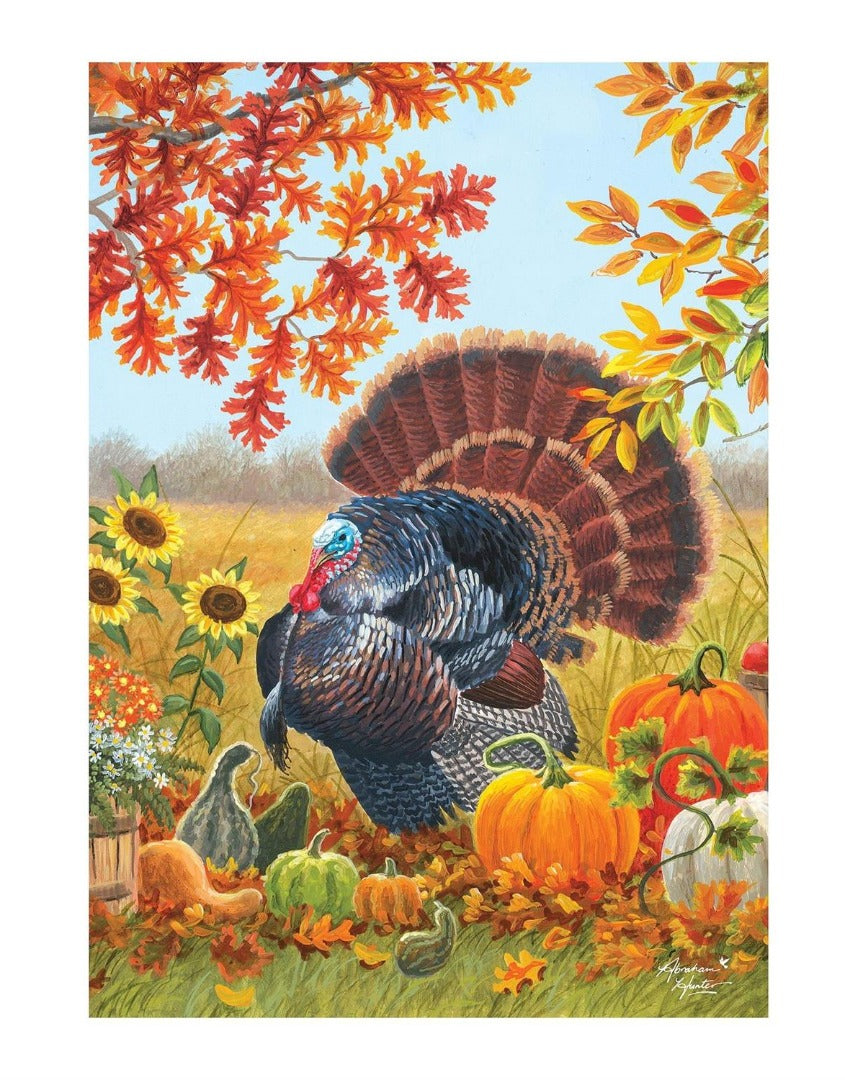 Celebrate the spirit of Thanksgiving with our vibrant double-sided Harvest Garden Flag! This eye-catching flag showcases a beautifully illustrated scene brimming with the warmth and abundance of the harvest season. The central focus is a majestic turkey, resplendent in its colorful plumage, standing proudly amidst a picturesque backdrop. Surrounding the turkey are the iconic symbols of Thanksgiving, including plump pumpkins, gourds, and sunflowers, all set against a canvas of falling autumn leaves. The rich, warm colors of the scene evoke a sense of comfort and gratitude, perfect for welcoming guests and adding a touch of seasonal charm to your outdoor decor.