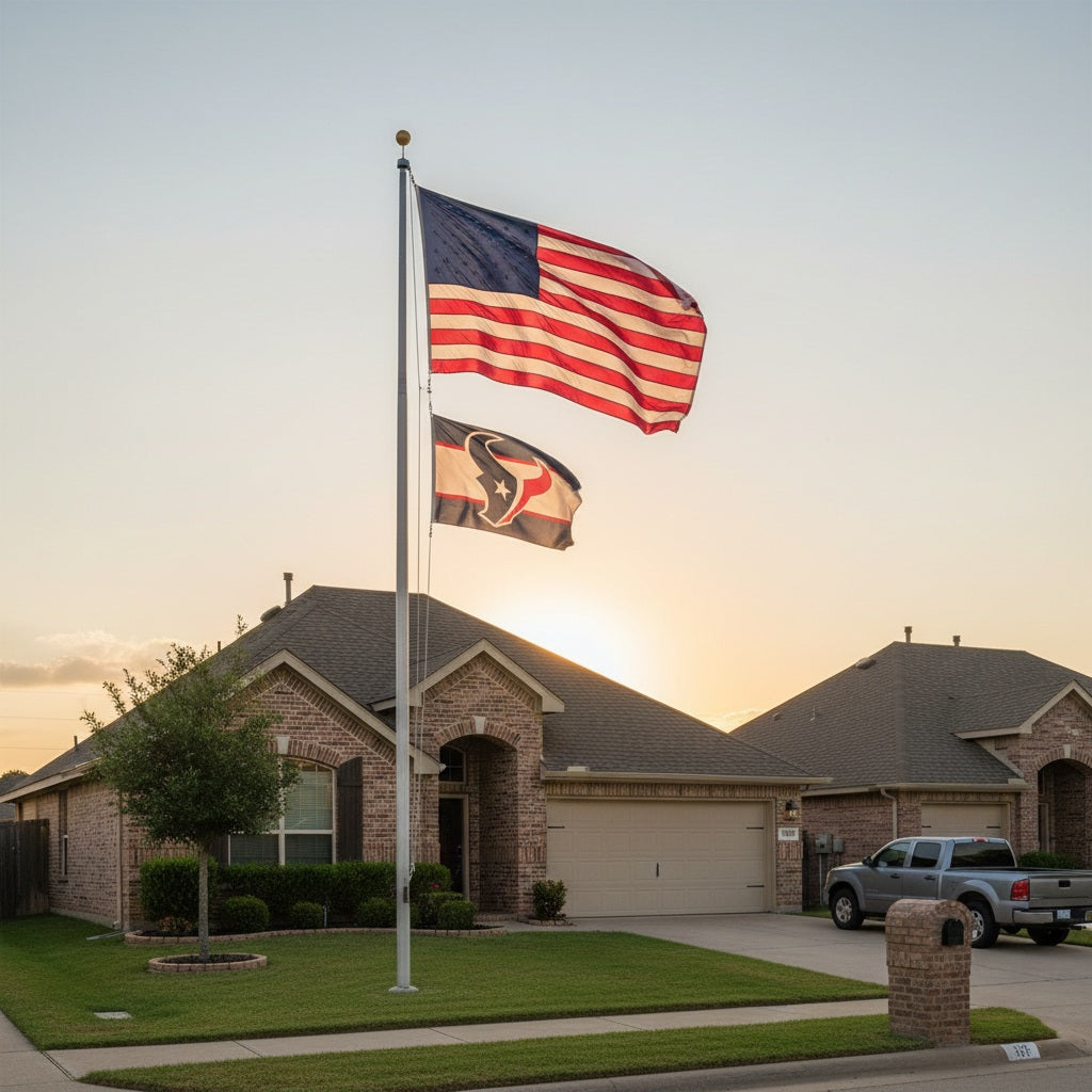 Show off your team pride with this officially licensed Houston Texans 3x5 flag. Featuring the iconic Texans logo on a bold striped background, the design reads correctly on one side, with the reverse side appearing mirrored. This single-sided NFL flag is crafted with vibrant colors that appear slightly lighter on the back. Picture illustrates how the design will appear from the front and back side.
