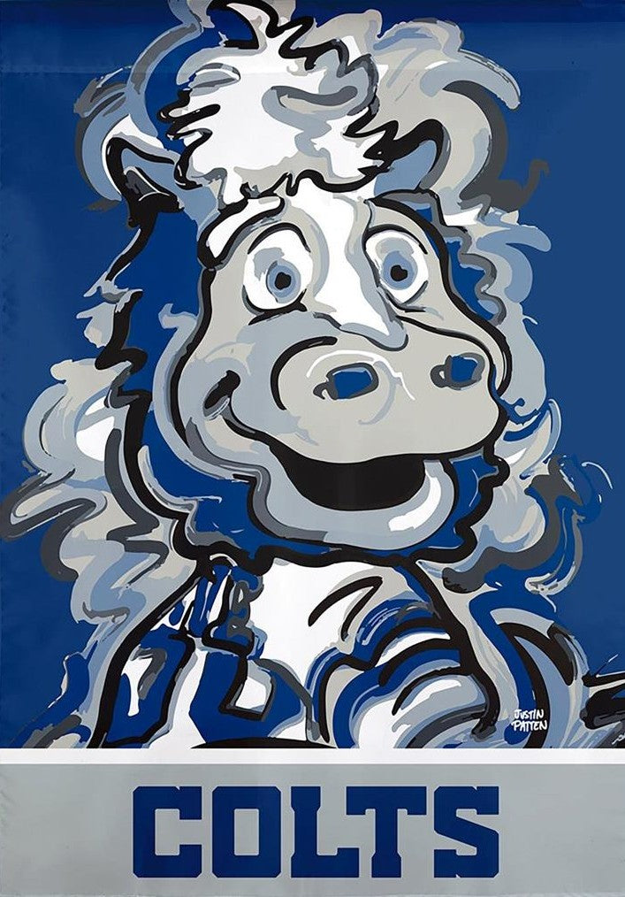 Show your pride loud and proud with this whimsical double sided Indianapolis Colts NFL garden flag. Indy fans will enjoy a flag that showcases an original work of art by painter Justin Patten. This flag features a comical take on the team's mascot Blue for a more artisan look that everyone will love to display to show support for the Indianapolis Colts. Fly from your garden stand (sold separately) or display indoors as window or wall decoration. Let's Go Colts!