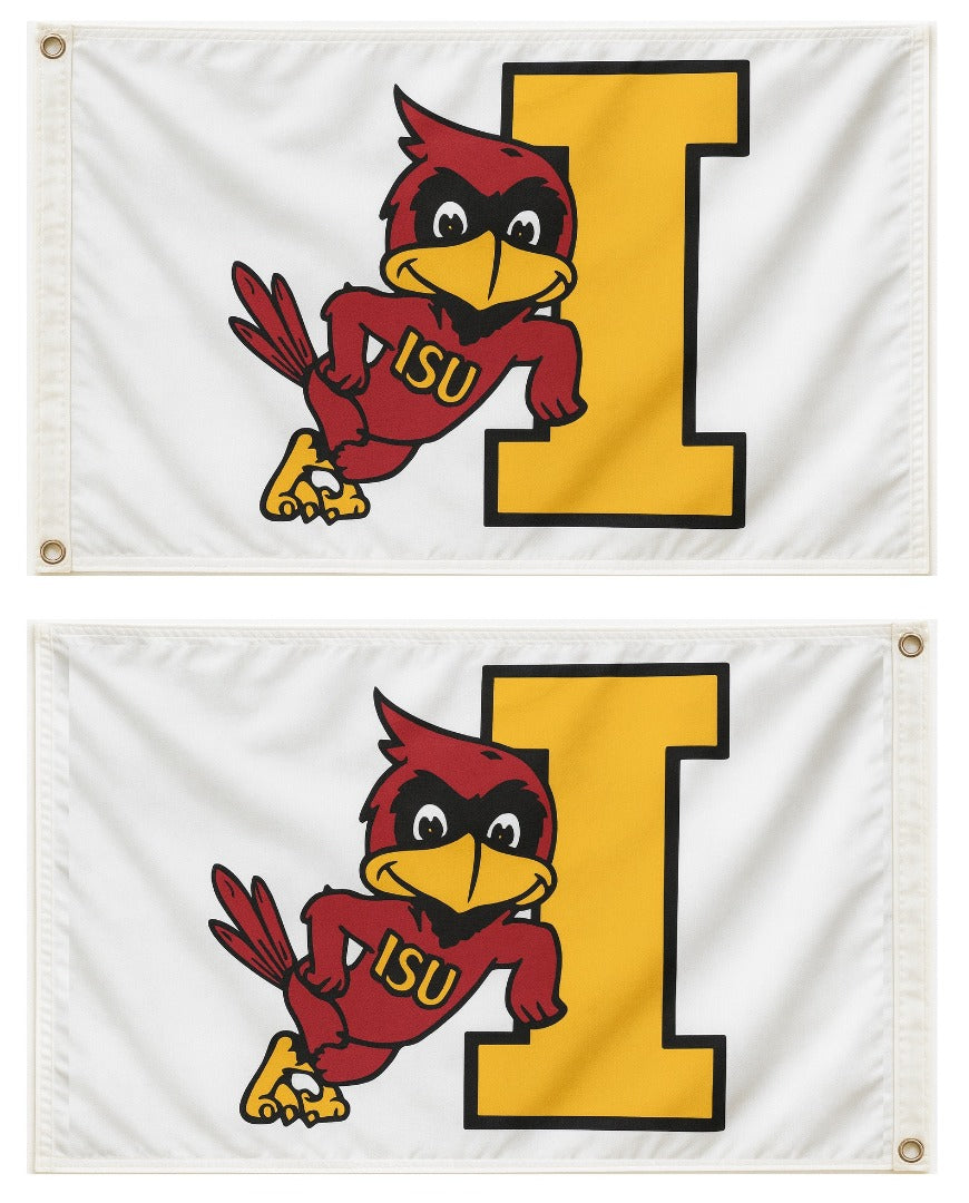 Iowa State Cyclones flag in size 3x5 feet with a licensed Leaning Cy double logo on white. The Leaning Cy logo reads correctly on both sides. Made out of premium 120g polyester, 4 rows of stitching around the whole flag, heading and grommets. You can fly this Iowa State Cyclones flag from your traditional, telescoping or tailgating flagpole - can also be displayed indoors as wall decoration for your bedroom, office, dorm room or garage. Since this is a double sided flag it is heavier than other flags and it will require a 15 mph wind or greater before it will start flying from your flagpole.