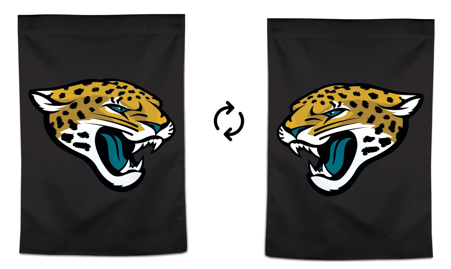 Jacksonville Jaguars vertical logo banner flag. The Jag logo on black is visible on both sides with the opposite side being backwards. Single sided NFL banner with the colors being lighter/faded on the back side. Picture illustrates how the logo will appear from the front and back side. Cheer on Jacksonville by flying this licensed banner from your house flagpole (sold separately) or display indoors as wall decoration. Made from polyester fabric with pole sleeve and tab. Printed in the United States on imported fabric.