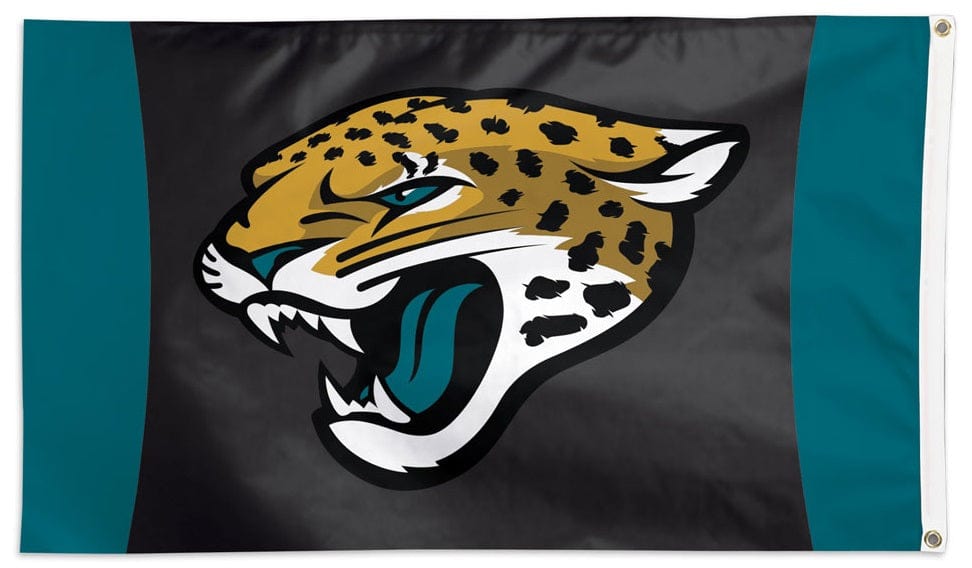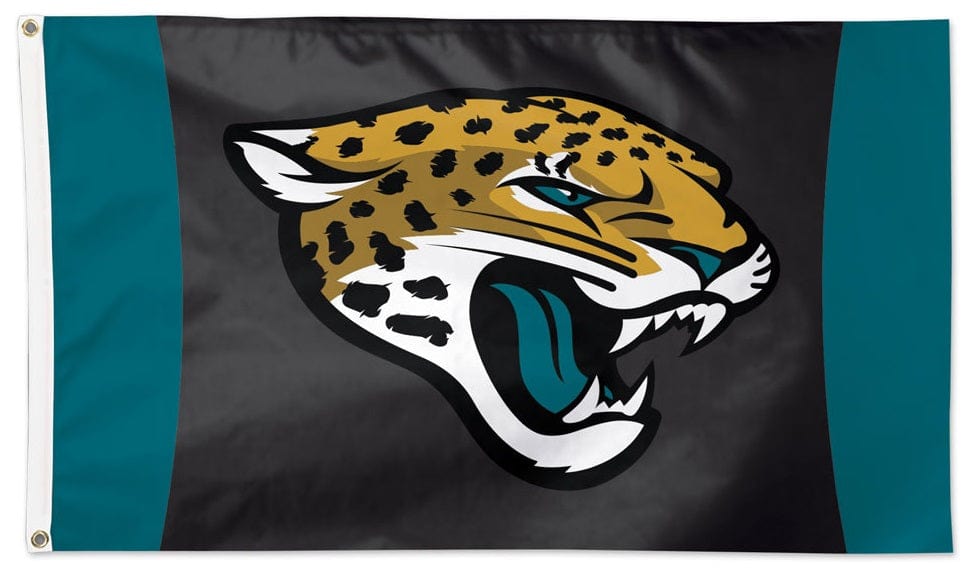 Officially licensed Jacksonville Jaguars 3x5 flag. The Jags logo on the vertical stripe background is visible on both sides with the opposite side being backwards. Single sided NFL flag with the colors being lighter on the back side - pictures show the front and back design on this Jacksonville Jaguars flag. Display your pride and passion by flying this official football Jacksonville Jaguars Wincraft flag from your traditional, telescopic or house flagpole (sold separately). Made of premium polyester with heading and two grommets on the left side - features four rows of stitching on the fly end for maximum durability whenn flown outside.