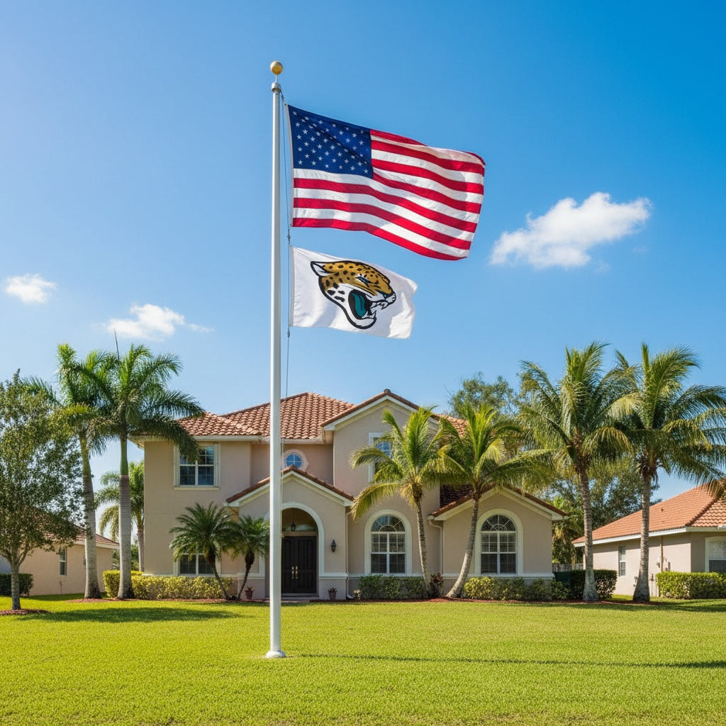 Jacksonville Jaguars white flag in size 3x5 feet. The Jags logo on the white flag is visible on both sides with the opposite side being backwards. Single sided NFL Flag with the colors being vibrant on both sides. Picture illustrates how the logo will appear from the front and back side. Display your pride and passion by flying this licensed Jacksonville Jaguars football flag from your traditional, telescopic or house flagpole (sold separately). Made from fade resistant 300 denier nylon with heading and two grommets - features four rows of stitching on all sides to help reduce fraying when flying outdoors.