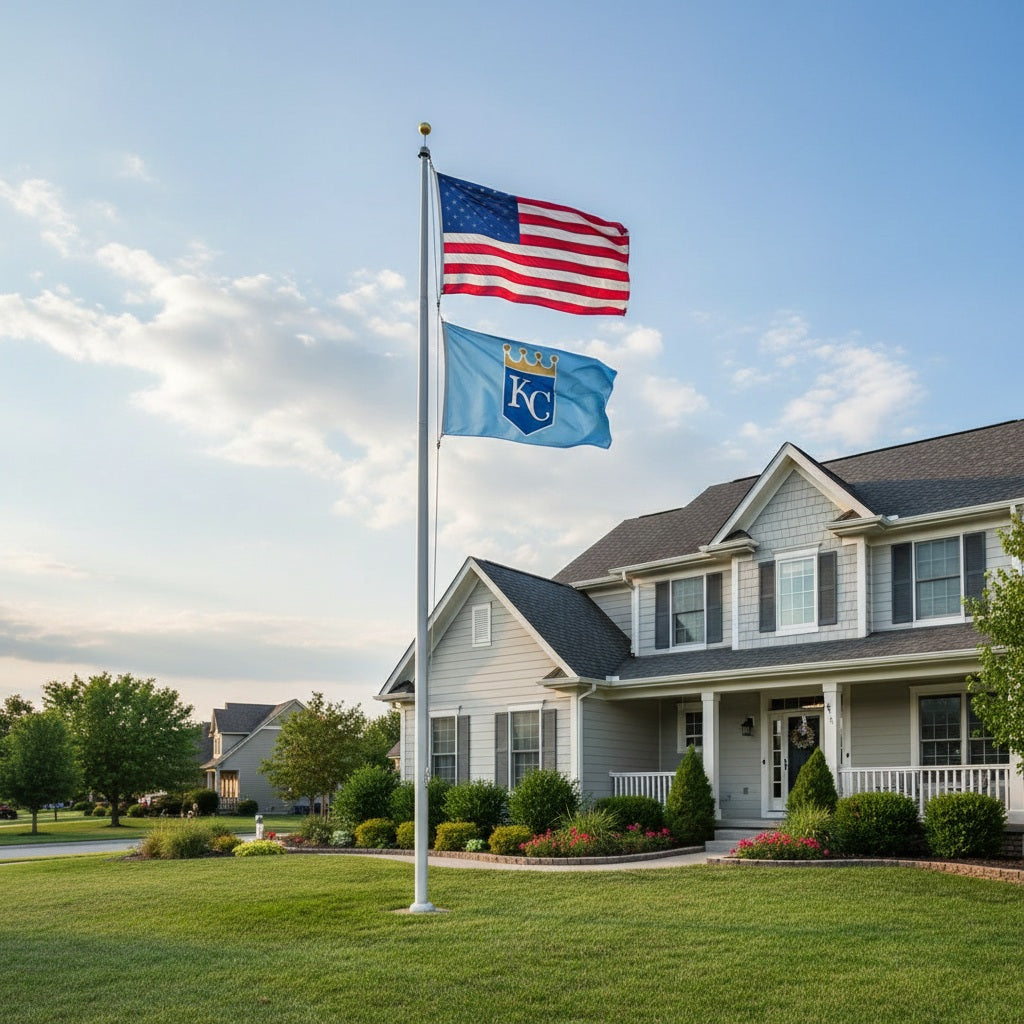 Officially licensed Kansas City Royals 3x5 baby blue flag. The Kansas City Royals crown logo reads correctly on one side only with the opposite side being backwards. Single sided MLB Flag with the colors being slightly lighter/faded on the back side. This deluxe 3x5 KC flag is designed to fly from your traditional, telescoping or tailgating flagpole - also looks great indoors when displayed as wall decoration for your office, bedroom, garage or dorm room. Made from premium 300d polyester with heading and metal grommets - reinforced fly end with 4 rows of stitching to help prevent fraying.