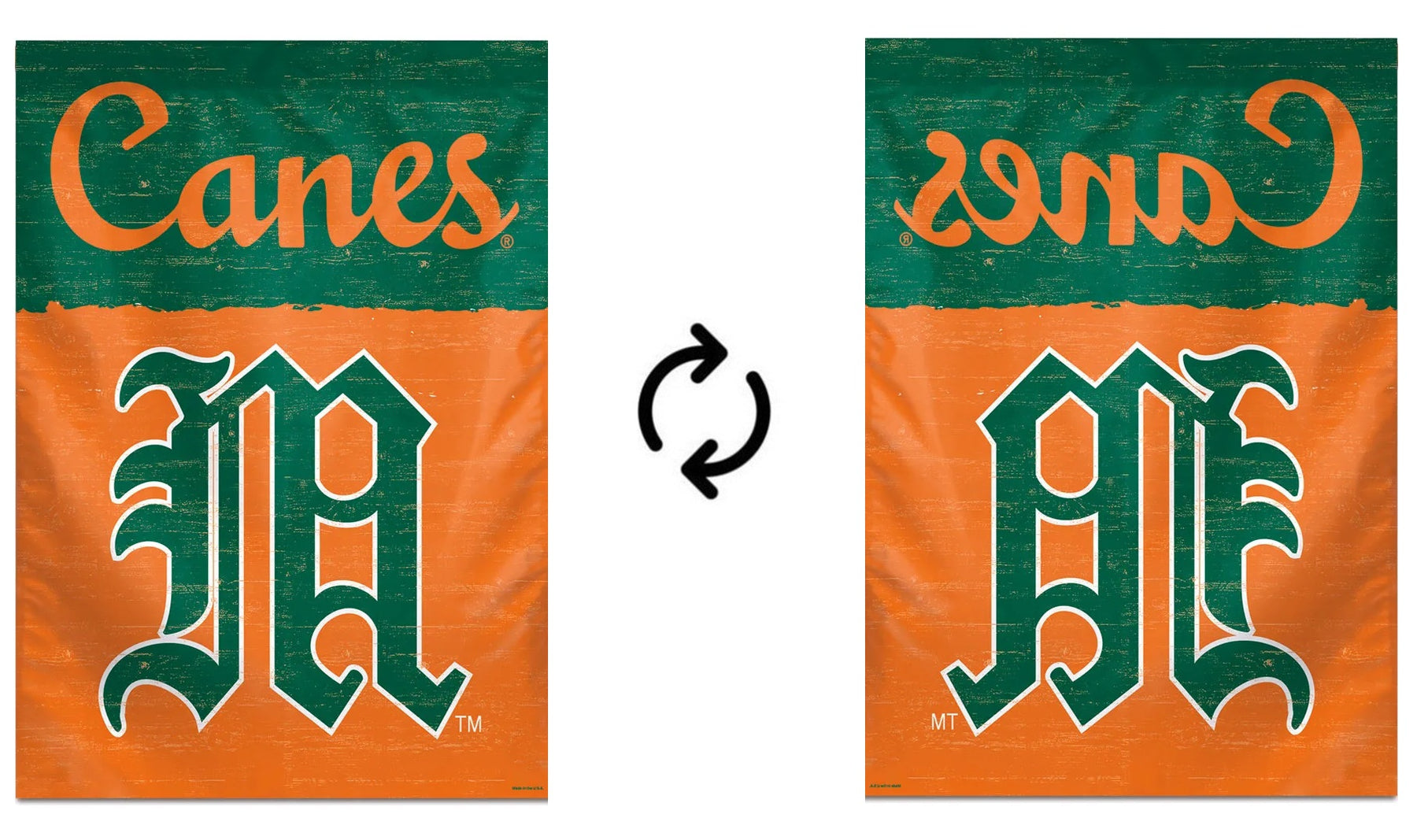 Miami Hurricanes vintage logo banner in size 28x40 inches. The University of Miami throwback vault logo and wording reads correctly on one side only with the opposite side being backwards. Single sided with the colors being a little lighter/faded on the back side - picture illustrates how the design will appear from the front and back side. Display your Canes pride by flying this vertical licensed banner from your house flagpole (sold separately). Made from polyester with pole sleeve and tab. Made in the USA.