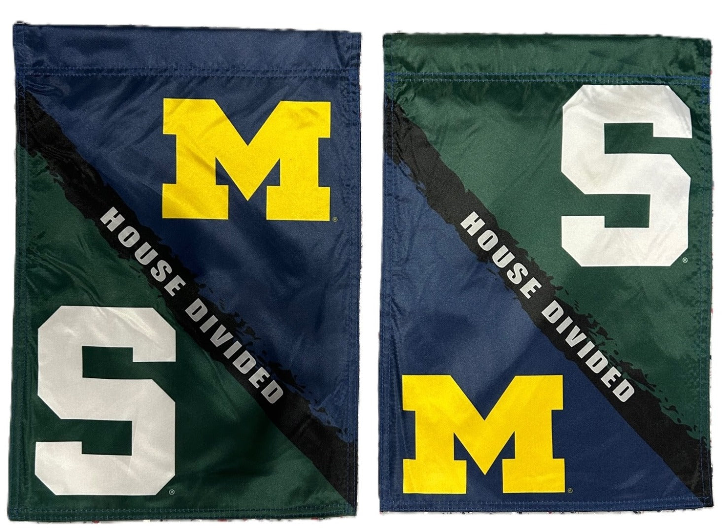 Officially licensed Michigan State and Michigan double sided house divided garden flag. This house divided garden flag will hang vertically from any standard garden stand (sold separately) or it can also be displayed as window or wall decoration. Made out of satin polyester fabric with digitally printed logo's on both sides - see picture for the front and back sides on this school approved garden flag.