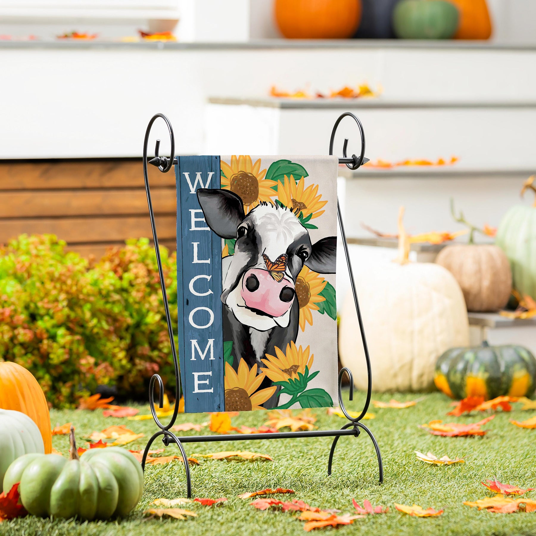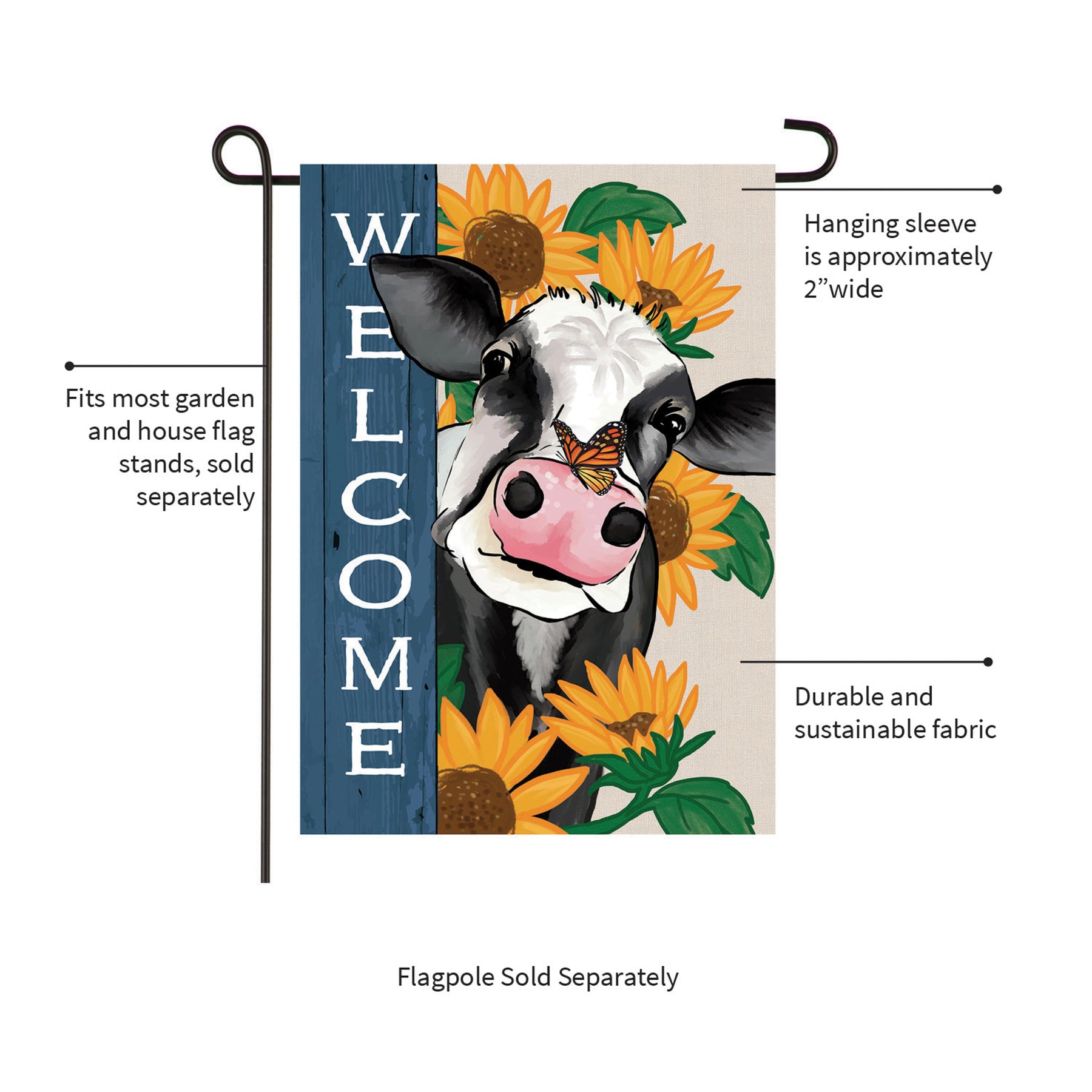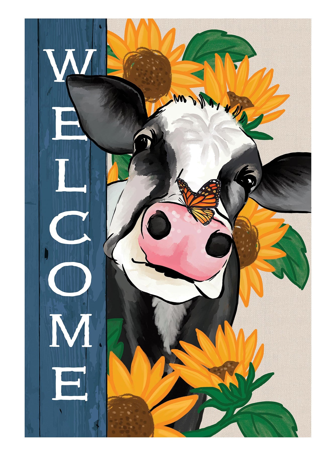 Welcome moo-sical guests to your home with this charming double-sided fall garden flag! A playful black and white cow, framed by vibrant sunflowers, peeks out from behind a rustic wooden welcome sign. The cow's friendly expression and a delicate butterfly resting on its nose add a touch of whimsy to this adorable design. Perfect for a porch, patio, or garden, this flag will surely bring a smile to visitors and a touch of country charm to your home. The double-sided design ensures a welcoming message from both sides. This delightful flag is a must-have for all cow enthusiasts and lovers of autumn's beauty, making it the perfect addition to any farm-inspired decorations. Enjoy the warm hues of the sunflowers and the friendly gaze of the cow as they greet your guests.