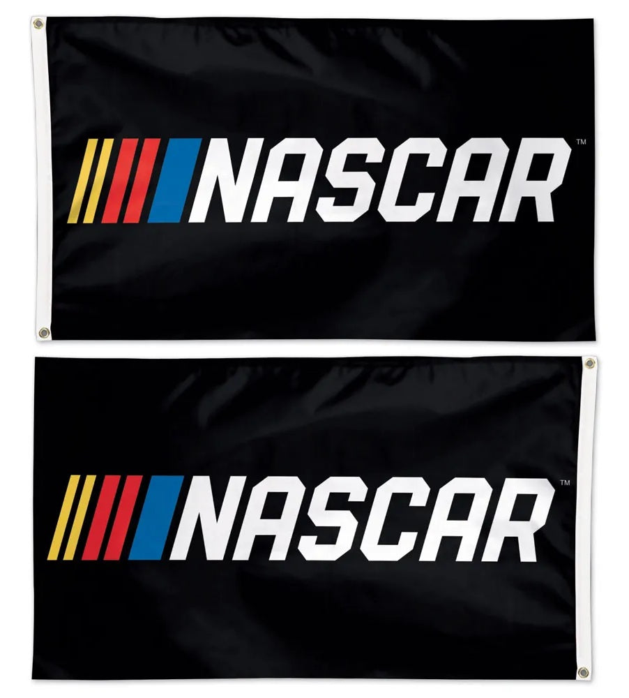 Showcase your racing pride with this officially licensed, double-sided NASCAR flag. Featuring the iconic logo set against a sleek black background, the design reads correctly from both sides, ensuring maximum visibility. Picture illustrates how the design will appear from the front and back side. Constructed from heavy-duty polyester, this premium flag consists of two individual flags sewn together with a middle liner for added durability and a high-quality finish. Equipped with a sturdy heading and metal grommets, it is perfect for flying from a flagpole, decorating your space, or bringing to your next tailgate.