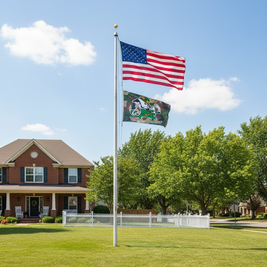 Officially licensed Notre Dame Fighting Irish 3x5 flag. The Leprechaun logo on the camo background is visible on both sides with the opposite side being backwards. Single sided with the colors on the back side being lighter - pictures show the front and back sides of this Standard Issue Notre Dame flag. You can fly this Notre Dame flag from your flagpole (sold separately) or display in your room or garage. Made out of premium polyester with heading, grommets and reinforced fly end for maximum durability when flown outside. Support our Armed Forces and the University of Notre Dame at the same time with this flag.