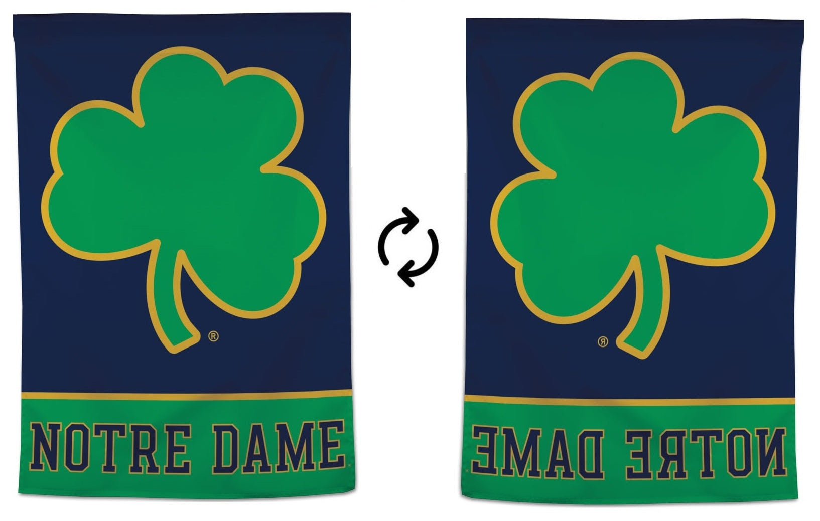 Officially licensed Notre Dame Fighting Irish house banner. The Notre Dame clover logo and wording reads correctly on one side only with the opposite side being backwards. Single sided school approved banner with the colors being slightly lighter/faded on the back side. Picture illustrates how the design will appear from the front and back side. Support the Irish and fly from your house flagpole (sold separately). Made out of polyester with pole sleeve and tab. Printed in the United States on imported fabric.