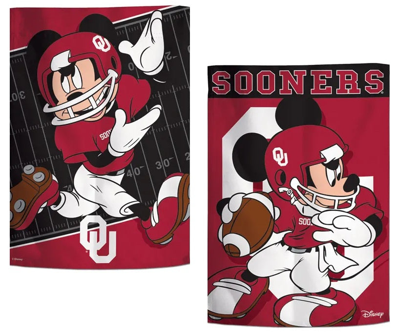 Officially licensed Oklahoma Sooners 2 sided garden flag. This licensed Disney Mickey Mouse football garden flag features two different designs in one flag - see the picture for the front and back view. Made out of polyester fabric with a 1 inch sleeve for flying from your garden stand (sold separately) - Display in your window or as wall decoration. Show your passion for Mickey Mouse and the University of Oklahoma with this licensed Sooners garden flag.