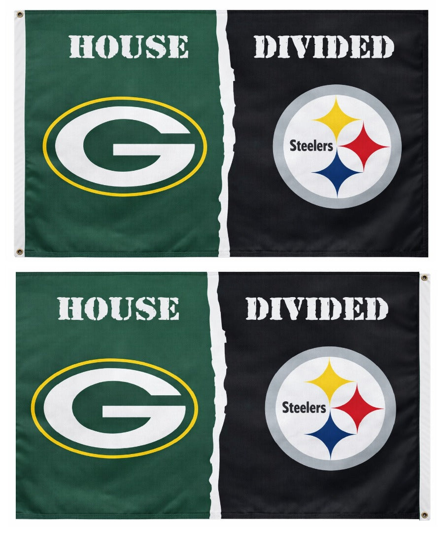 Green Bay Packers and Pittsburgh Steelers house divided flag in size 3x5 feet with a 2-sided design. The licensed Packers and Steelers logo along with the wording reads correctly on both sides. Picture illustrates how the design will appear from the front and back side. When your house supports both NFL teams this is the flag you should fly from your traditional, telescoping or house flagpole (sold separately) so both sides are represented. Made from fade resistant 100d nylon fabric and finished with heading, two grommets and four rows of stitching around the entire flag for maximum durability when flown outside.