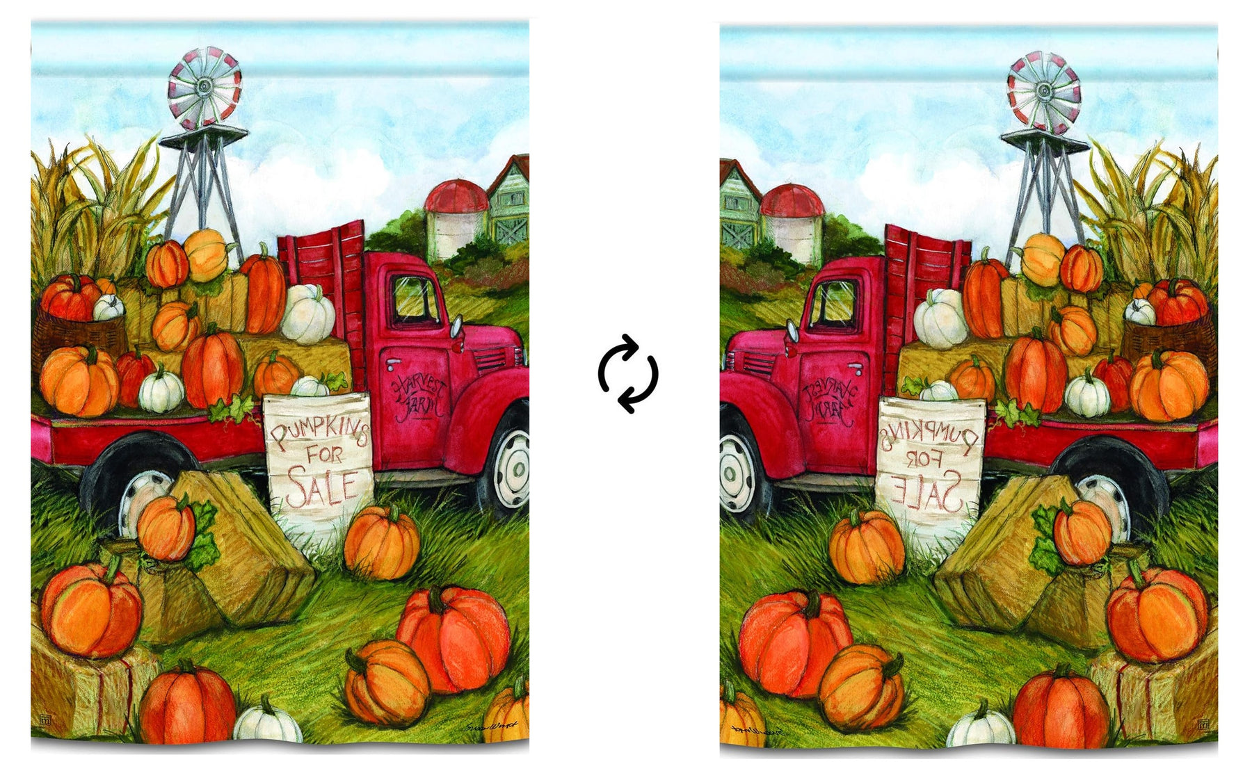Welcome the enchanting hues of autumn to your doorstep with our exquisite Fall House Banner! This charming decorative piece is a vibrant celebration of the season, designed to infuse your home with warmth and festive cheer. Adorned with a captivating illustration of a vintage red truck overflowing with a bounty of pumpkins, it's the perfect way to express your love for fall. The design reads correctly on one side only with the opposite side being backwards - picture shows how the design will appear from the front and back side.