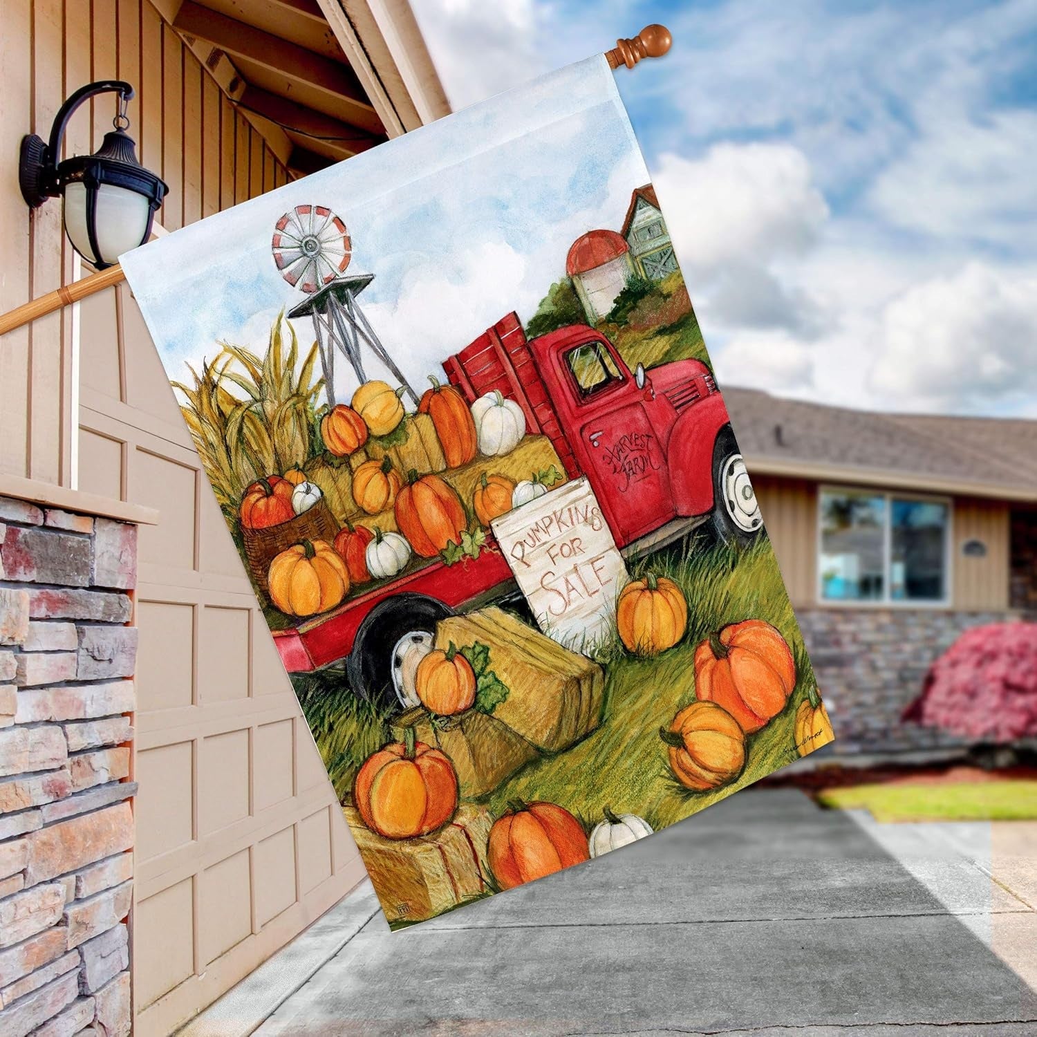Crafted from durable, weather-resistant material, this vertical banner promises lasting beauty, season after season. The rich, detailed artwork showcases a quaint pumpkin patch scene complete with a charming windmill and a "Pumpkins for Sale" sign, evoking the nostalgic essence of harvest time.