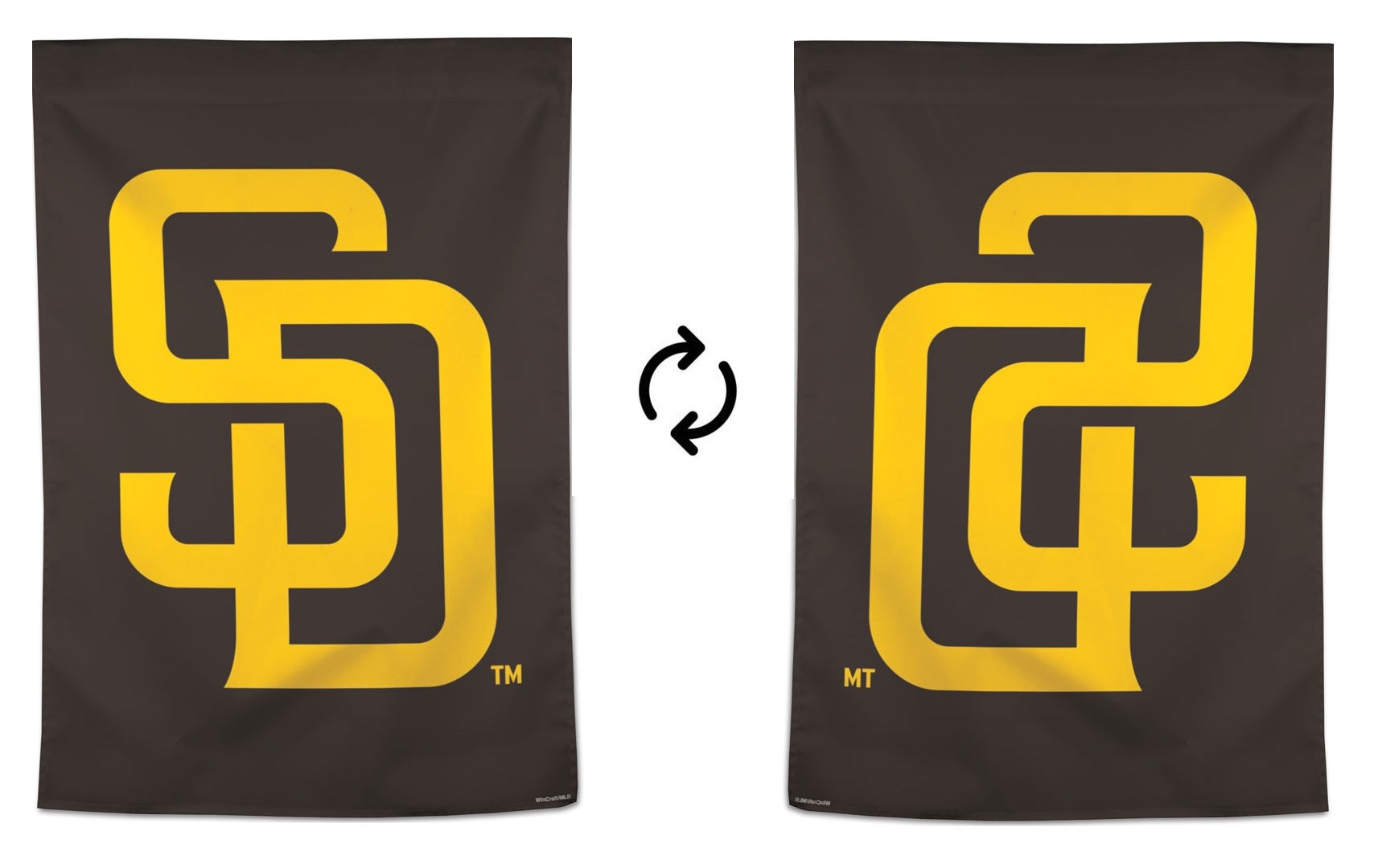San Diego Padres vertical MLB banner. This licensed house flag features the official SD logo on brown - the logo and wordng reads correctly on one side only with the opposite side being backwards - picture shows how the logo will appear from the front and back side. Colors on the back side are appear lighter/faded. Display your pride and passion by flying this official MLB banner from any house flagpole (sold separately) or display indoors as wall decoration. Made from imported polyester fabric and finished with pole sleeve and tab. Printed in the United States.