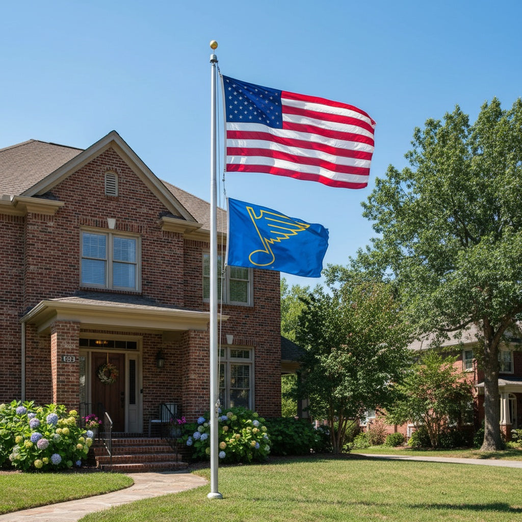 St. Louis Blues double sided flag in size 3x5 feet. The revised logo reads correctly on both sides of the flag - picture illustrates how the logo will appear from the front and back side. Made from fade resistant 100d nylon fabric and finished with a heading, two grommets and 4 rows of stitching around the entire flag to help reduce fraying. Since this is two flags sewn together with a liner between it is heavier than other flags and may require a 15 mph wind or more before it will start flying from the flagpole.