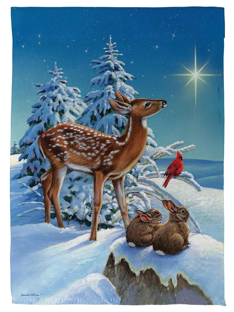 Bring the enchanting beauty of a winter wonderland to your garden with our "Starry-Eyed Woodland Friends" garden flag. This captivating flag features a heartwarming scene of woodland creatures, including a graceful deer, two adorable rabbits, and a vibrant cardinal, gazing up at a bright star in the night sky. The flag is designed with a two-sided print, ensuring that the charming illustration is visible from any angle in your yard or garden. The vibrant colors and detailed artwork are printed with high-quality inks, ensuring they remain vivid and fade-resistant over time. The flag's size is ideal for any standard garden flag stand, allowing you to easily add a touch of seasonal charm to your outdoor space. Whether you're a nature enthusiast, a lover of whimsical art, or simply seeking to add a touch of holiday magic, the "Starry-Eyed Woodland Friends" garden flag is a delightful choice.