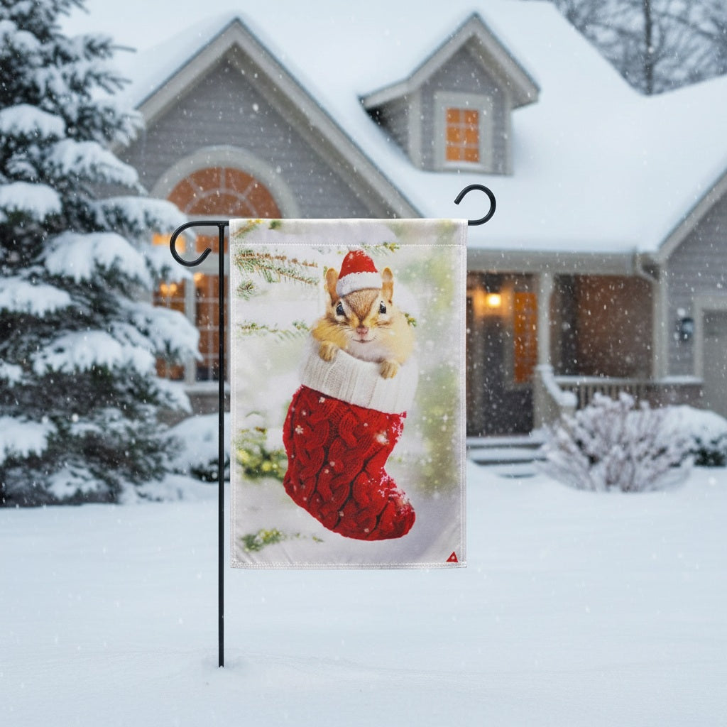 Welcome the spirit of the season to your home with our enchanting Whimsical Stocking Chipmunk 2-Sided Decorative Christmas Garden Flag! This delightful flag features a cheerful chipmunk nestled in a cozy red Christmas stocking, complete with a tiny Santa hat. The charming design, set against a backdrop of glistening snow and evergreen boughs, instantly evokes the warmth and joy of Christmas. Easy to hang and maintain, this flag is a hassle-free way to spread Christmas joy. Let this adorable chipmunk welcome your guests and spread the magic of the season, one glance at a time. Get yours today and transform your outdoor space into a winter wonderland!