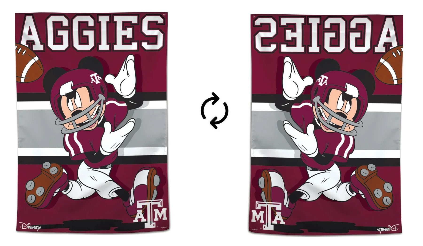 Officially licensed Texas A&M Aggies banner. This flag features Disney's Mickey Mouse catching the football in a Aggies uniform - the image and wording reads correctly on one side only with the opposite side being backwards. Single sided banner with the colors being lighter/faded on the back side. Picture illustrates how the design will appear from the front and back side. Combine your love for Mickey Mouse and the Texas A&M Aggies by flying this licensed University flag from your house flagpole (sold separately) or display indoors as wall or room decoration. Made out of polyester with pole sleeve and tab. Printed in the United States on imported material.