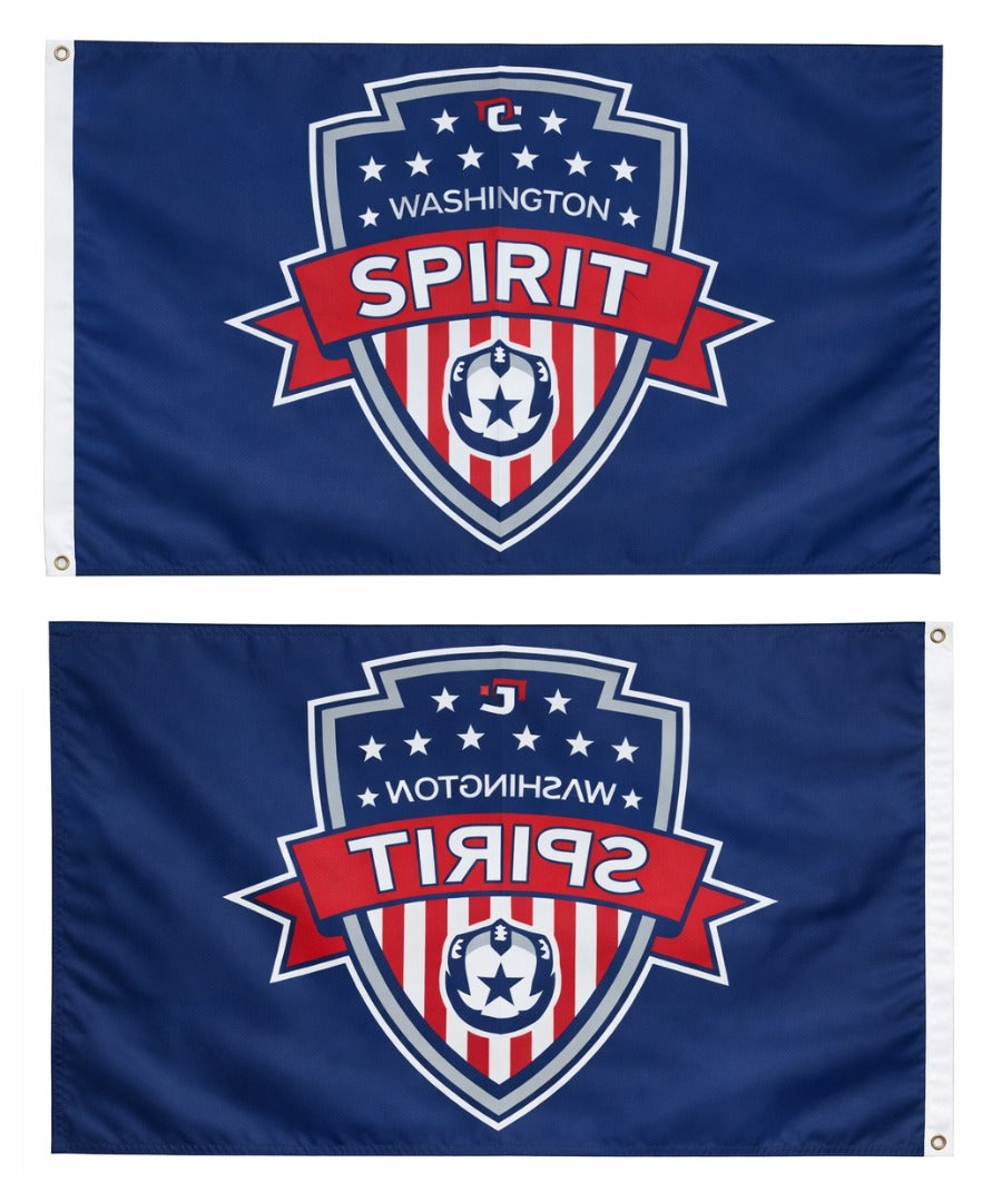 Washington Spirit blue flag in size 3x5 feet.The NWSL Spirit logo and wording reads correctly on one side only, the opposite side is backwards. Single sided with the colors being vibrant on both sides. Picture shows how the logo and wording will appear from the front and back side.Take this official NWSL flag with you to the soccer match or display on your traditional, telescoping or house flagpole (sold separately). Made out of 300D fade resistant nylon with heading and two grommets on the left side. Four rows of stitching around the entire flag making this the most durable flag available.