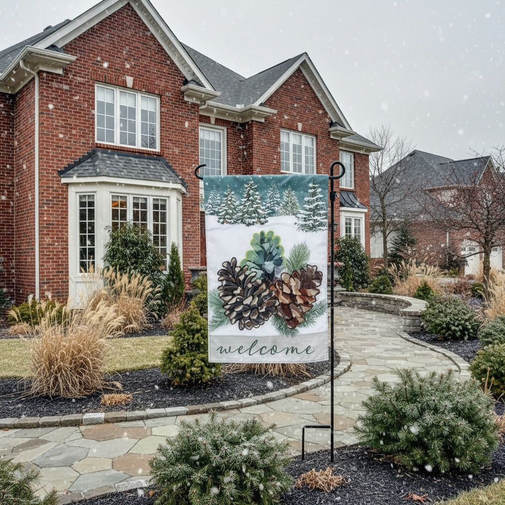 Welcome guests to your home with this charming two-sided applique winter pinecones garden flag. The flag features a snowy winter scene at the top, complete with snow-covered evergreen trees. The bottom half of the flag showcases a detailed arrangement of three appliqued and embroidered pinecones in varying shades of brown, green and teal. Delicate pine needles are artfully arranged around the pinecones. A stitched "welcome" message in a graceful script adds a warm touch to the flag's design. This garden flag is made from durable 310 denier nylon, weather-resistant material, ensuring it can withstand outdoor elements. Whether used during the winter holidays or throughout the colder months, this garden flag adds a touch of seasonal beauty and a welcoming vibe to any outdoor space.