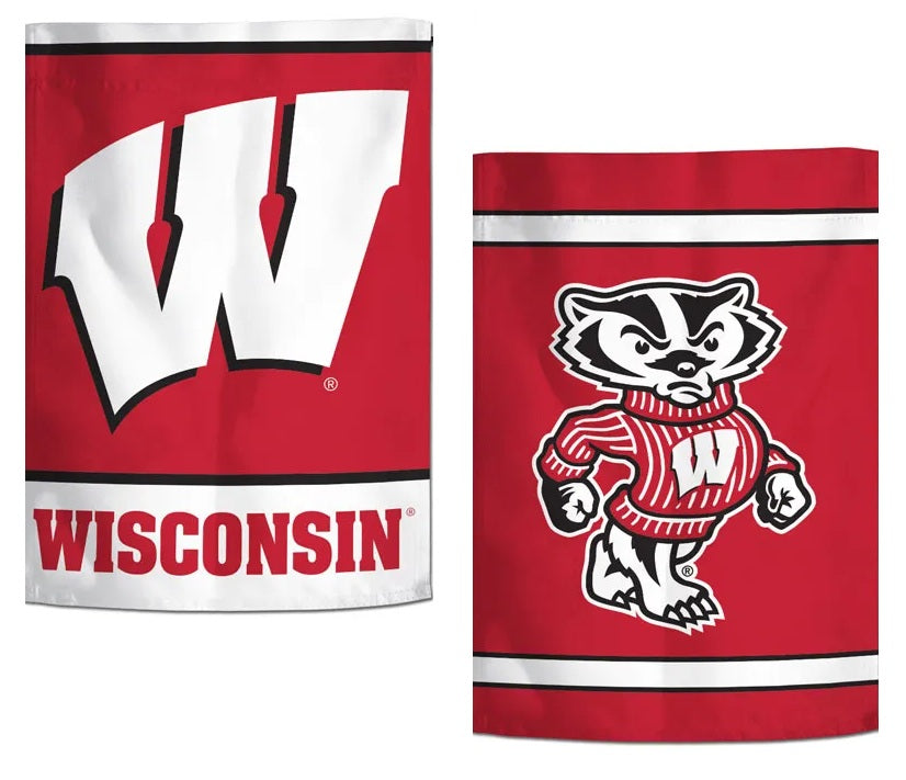 University of Wisconsin double sided garden flag featuring two different designs. Picture displays the front and back side of this licensed Wisconsin Badgers 2-sided garden flag. Support Bucky Badger by displaying this garden flag from your garden stand (sold separately) or display indoors as window decoration. Made from imported soft polyester fabric and finished with a mini pole sleeve in the top. Printed in the United States.