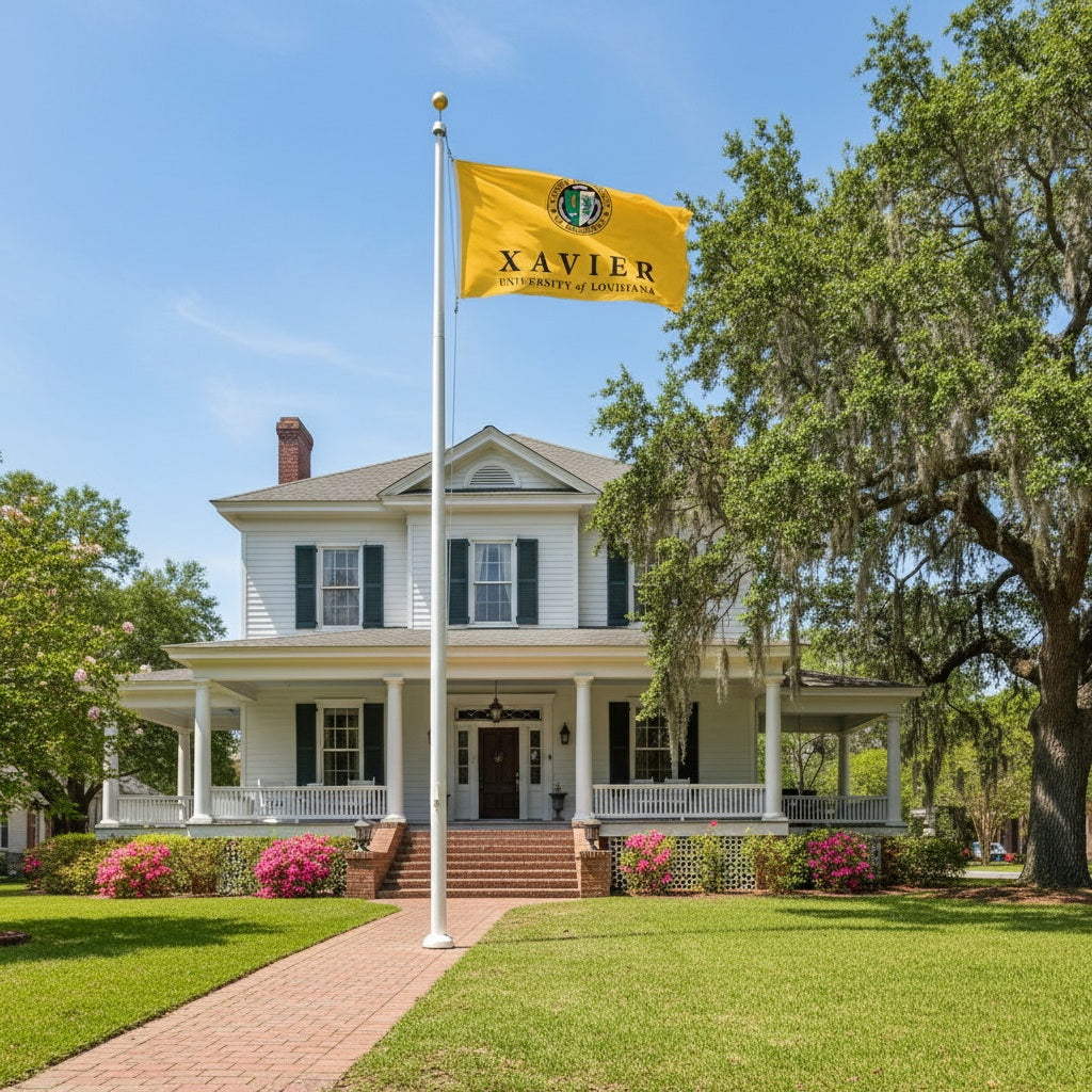 Xavier University of Louisiana 3x5 feet flag with a 2-sided design. The Xavier crest logo and wording are visible from both sides. Due to its double-sided design, this flag is heavier than standard flags, requiring a wind speed of 15 mph or higher to fly from your flagpole. You have the option to display this Xavier flag on a flagpole (sold separately) or use it as a wall or office decoration. Crafted from fade resistant 100d nylon fabric, it features a header, two grommets, and four rows of stitching on all edges for enhanced durability and to help reduce fraying.